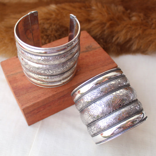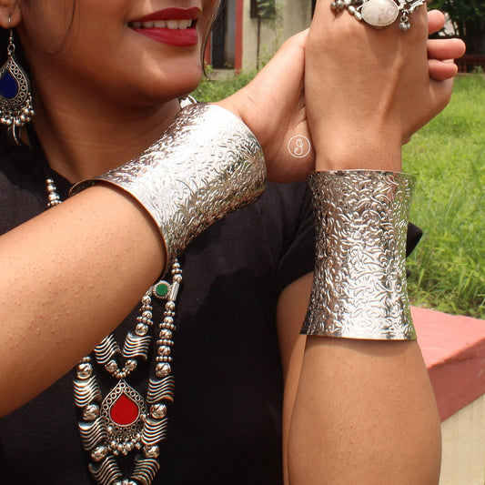 Silver Carved Long Hand-Cuff Bracelet Pair