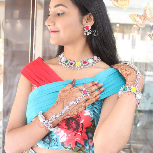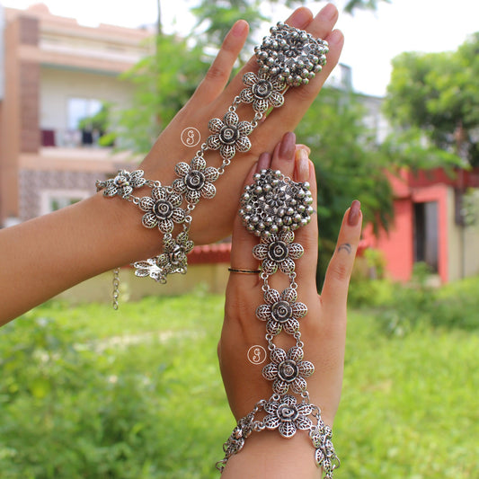 Flower Design Oxidised Silver Hathful Bracelet(Single)