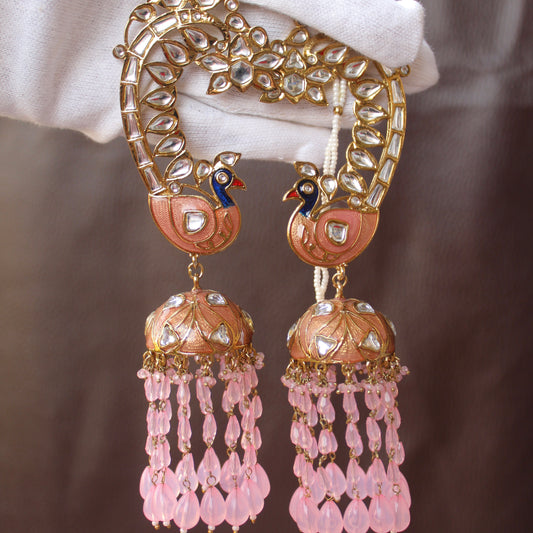 Pink Ethnic Peacock Jhumki With Earcuff