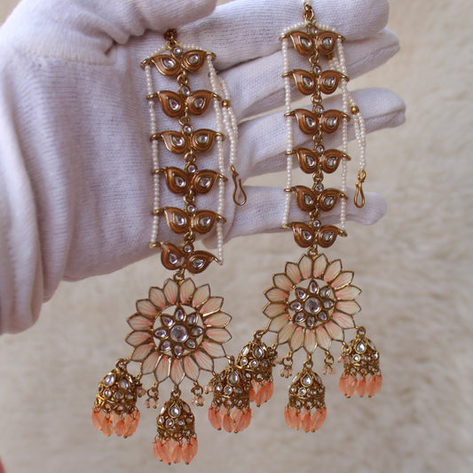 Peach Floral Ethnic Earrings With Earchains
