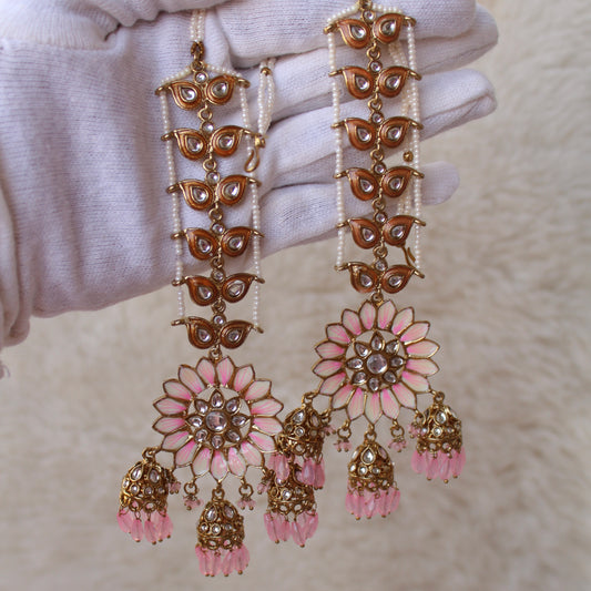 Pretty Pink Ethnic Earrings With Attached Earchains