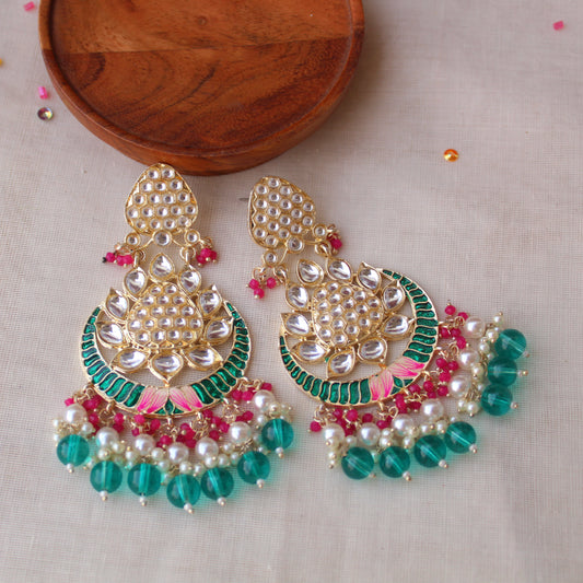 Teal Blue & Pink Kundan & Beads Work Chandbali