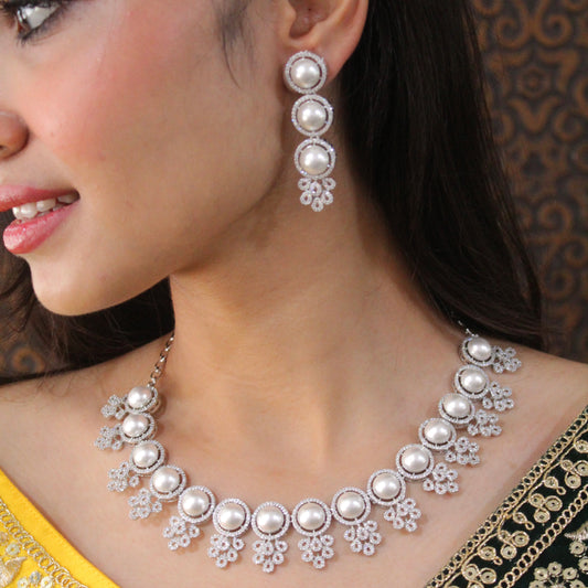Classy White Pearls & Diamonds Work Necklace Set