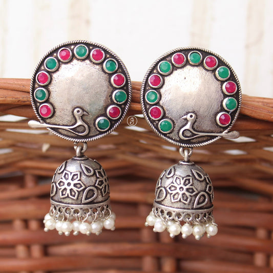 Pretty Oxidised Silver Peacock Design Jhumki