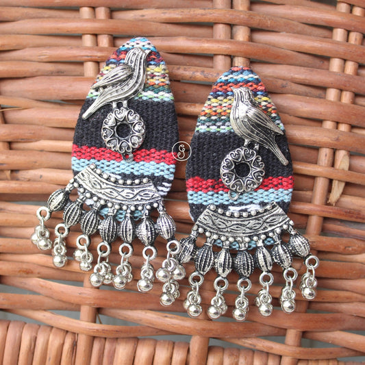 Black Fabric & Oxidised Silver Work Earrings