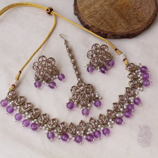 Lavender & Golden Necklace Set With Tika