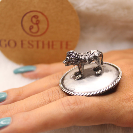 3D Lion Statue Oxidised Silver Brass Ring