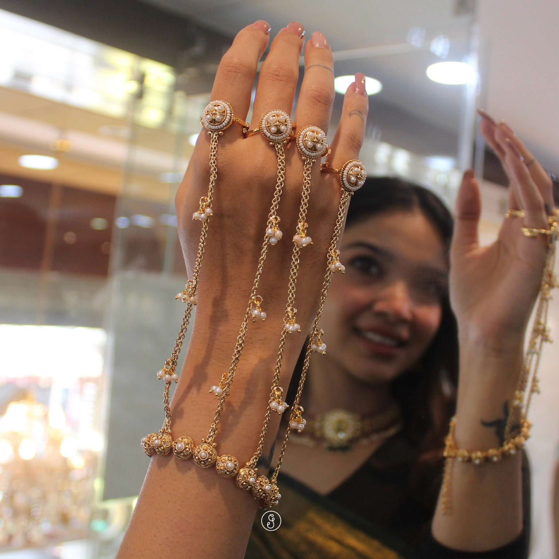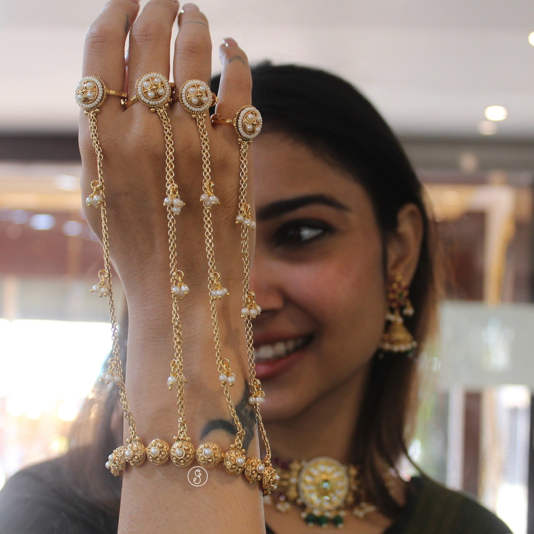 This elegant Kashmiri Hatpool hand accessory is crafted from premium quality brass and finished in a rich antique gold tone that gives it a timeless, heritage-inspired look. Designed with four attached rings connected to a bracelet, this piece features beautifully detailed round motifs with pearl work and delicate hanging chains that add grace and movement to your hands. The adjustable bracelet and ring sizes ensure a comfortable and flexible fit.