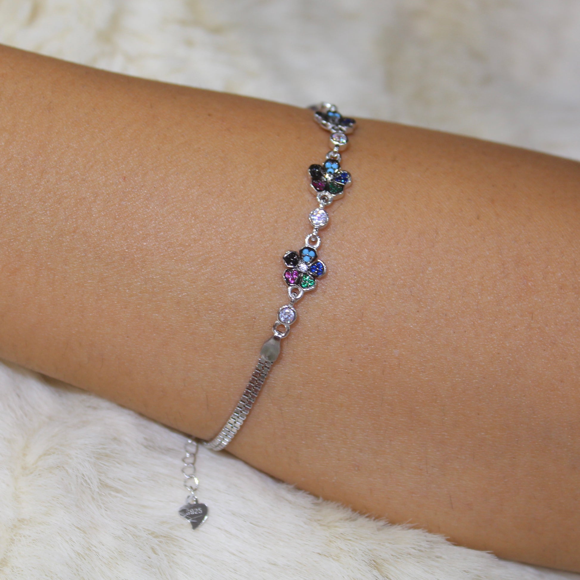 Delicate, feminine, and effortlessly elegant — this 92.5 pure silver bracelet is designed to add a soft pop of colour to your everyday style. Featuring tiny floral motifs adorned with multicolour CZ stones and connected with subtle round crystal accents, this bracelet reflects charm in the most graceful way. The sleek silver finish enhances its refined appeal, while its adjustable design with a lobster hook and extension rings ensures a comfortable and perfect fit for every wrist.