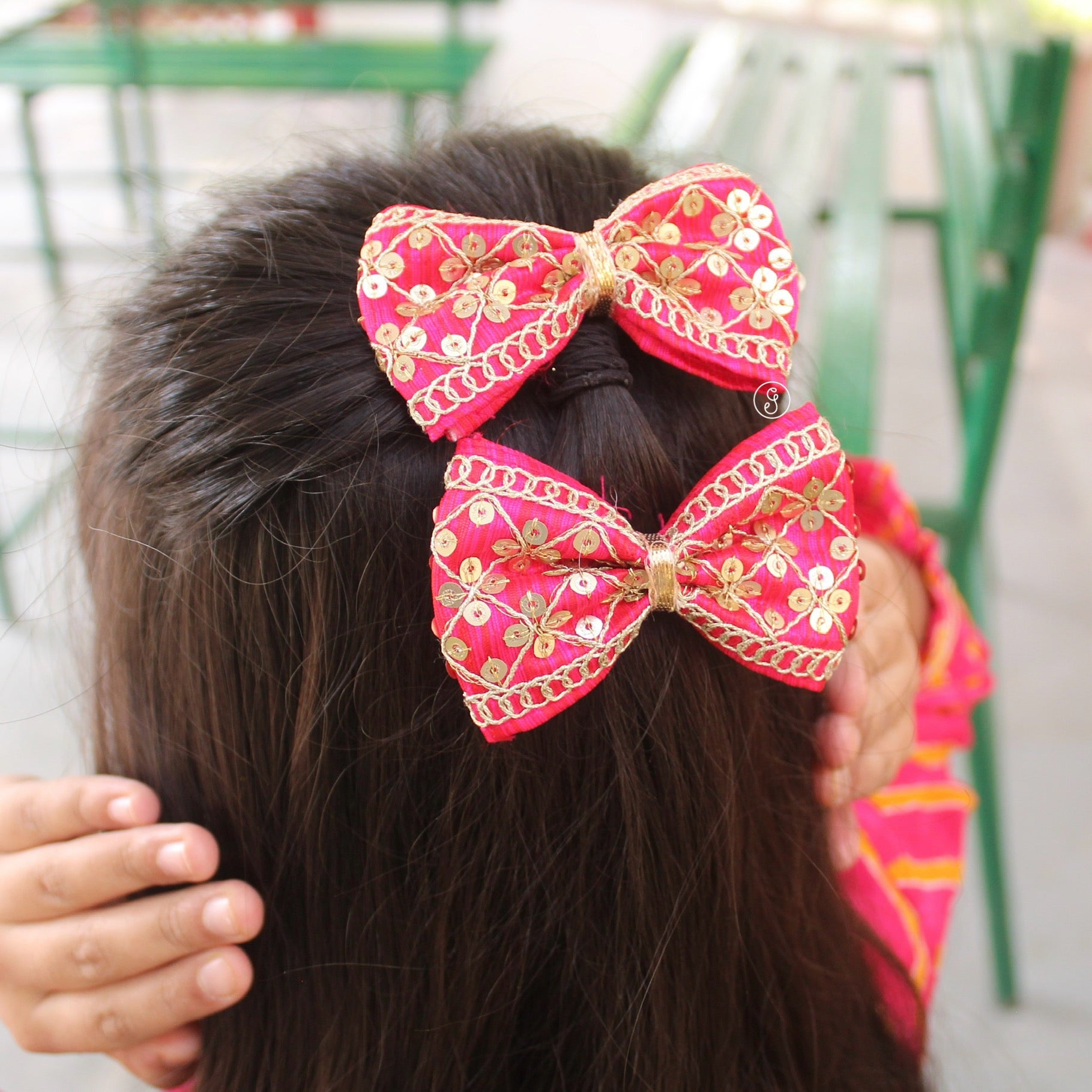 Vibrant and festive, this hot pink embroidered bow hair clip adds a lively splash of color to your ethnic hairstyles. Crafted with golden thread embroidery and delicate lace detailing, it features a durable alligator clip at the back for a comfortable and secure hold. Suitable for both kids and adults, this bow blends traditional artistry with a trendy festive look.