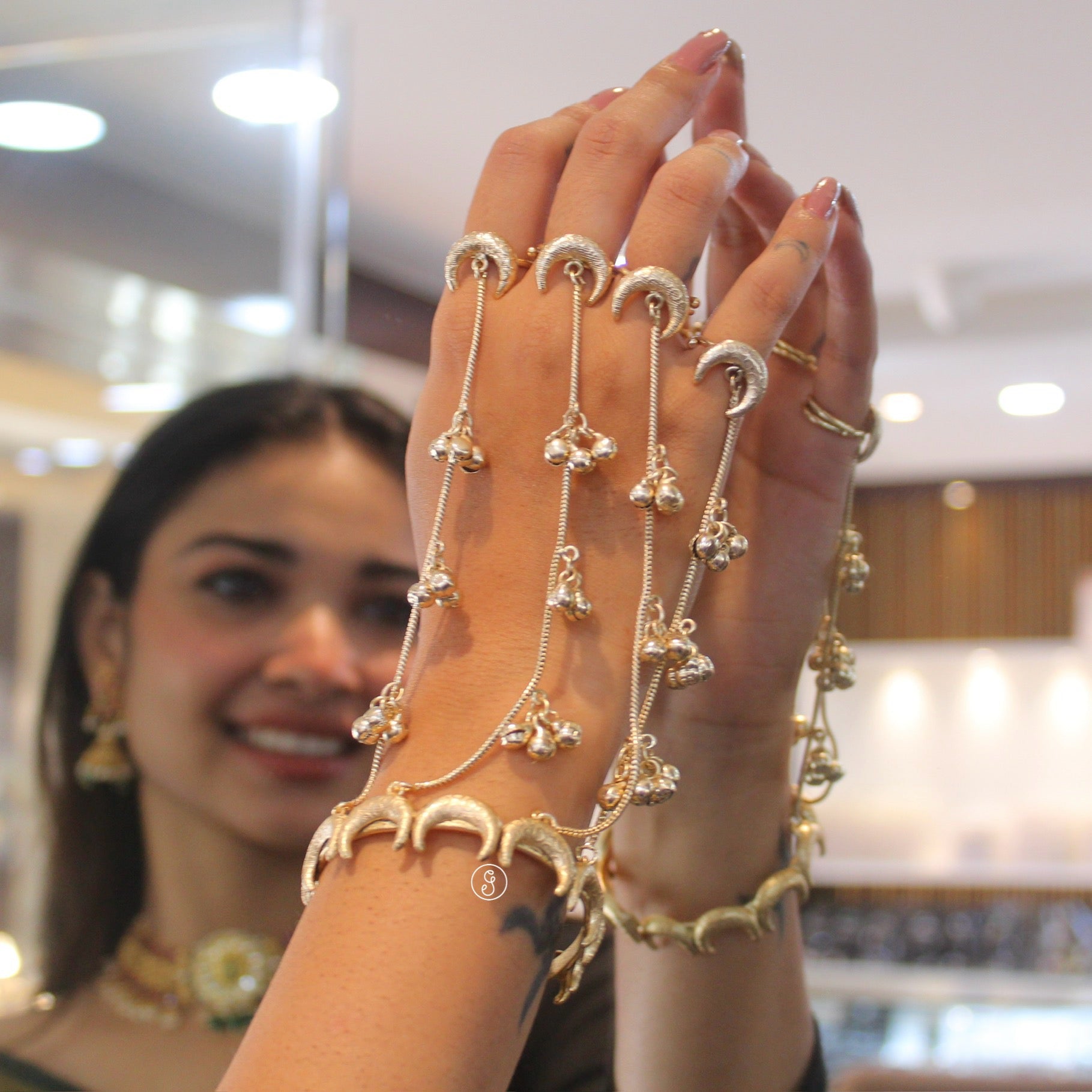 This elegant Kashmiri hathphool hand accessory features a beautiful moon (chand) motif and is crafted from premium quality brass with a rich matte gold finish. Designed with four attached rings connected to an adjustable bracelet, this piece is detailed with traditional ghungroo work that adds subtle movement and charm to your hands. The adjustable ring sizes and bracelet ensure a comfortable fit for all hand types.