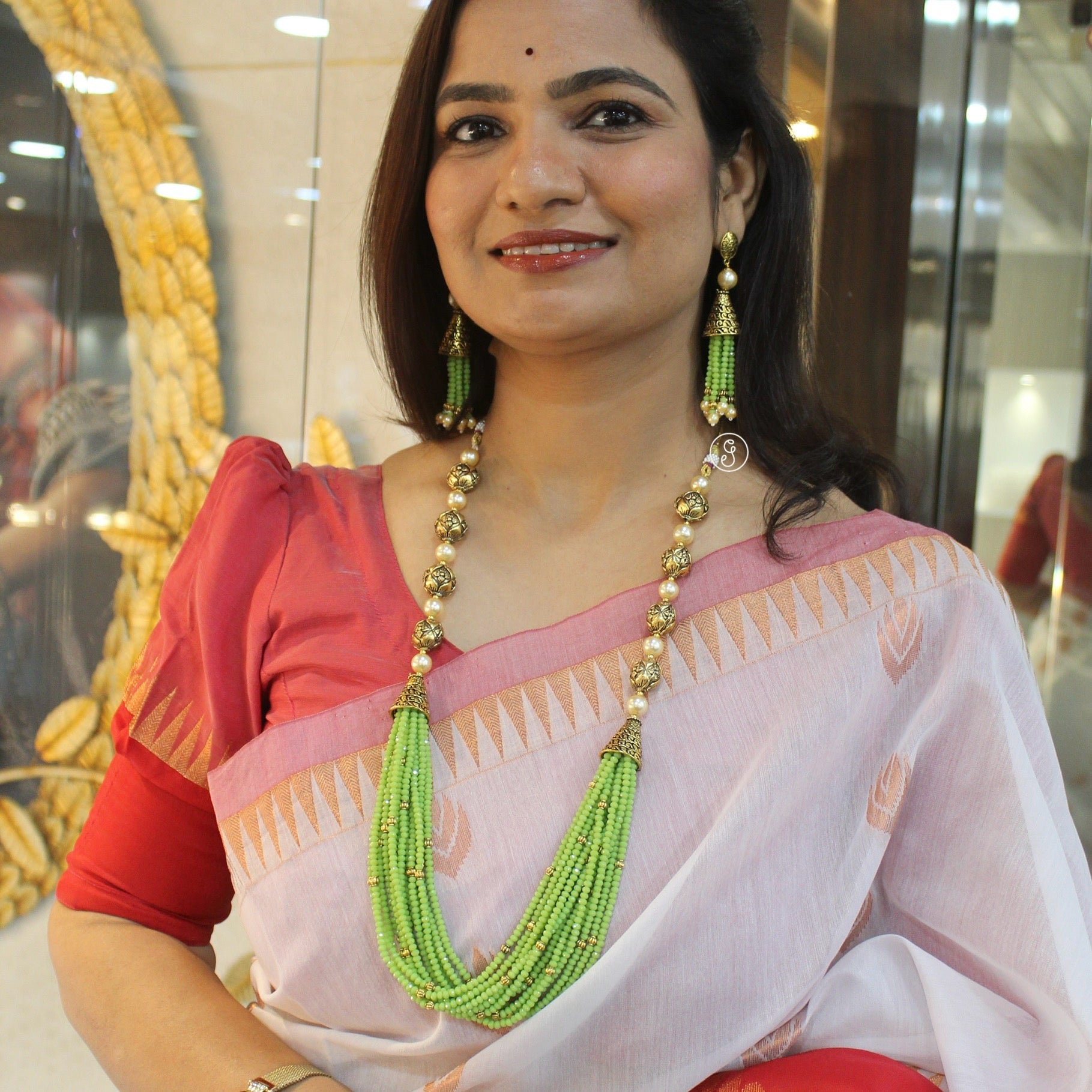 Add a touch of sophistication with this Mala-style necklace set featuring delicate mint green crystal beads paired with intricate golden brass bead work. Its multi-layered design gives it a rich and unique appeal, while the long-design matching earrings complete the set, creating a graceful and classy look.