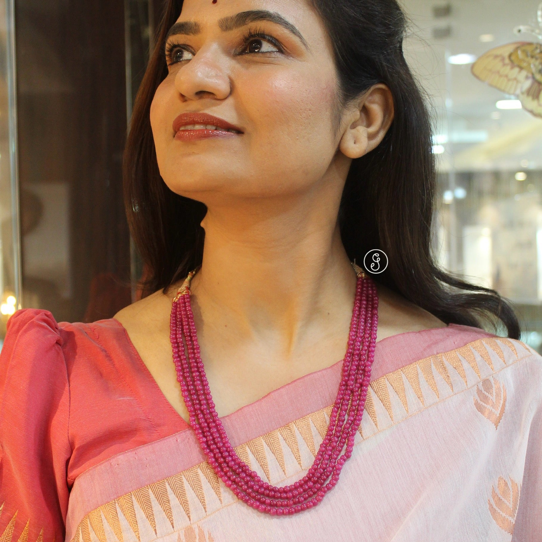 This gorgeous mala pairs beautifully with ethnic sarees, lehengas, Anarkalis, kurtis, or even solid-colored formal dresses and gowns. Its ruby-red tones enhance shades like cream, beige, gold, maroon, pink, or black, making it perfect for weddings, festive celebrations, formal events, or special gatherings.